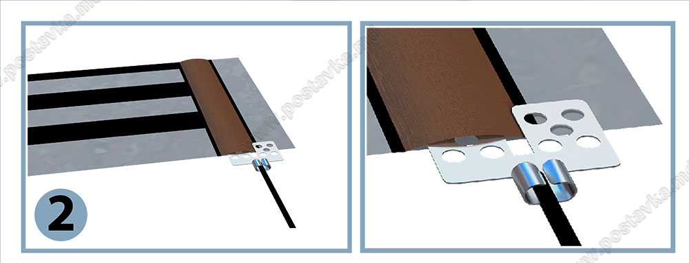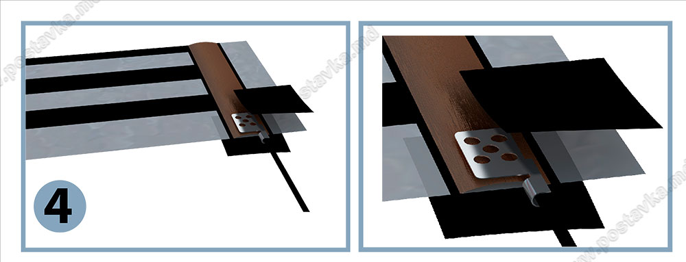 Рис. 2 - Вставьте клемму в токоведущую медную шину таким образом чтобы одна часть клеммы вошла внутрь термопленки, а вторая часть клеммы располагалась сверху токоведущей шины.