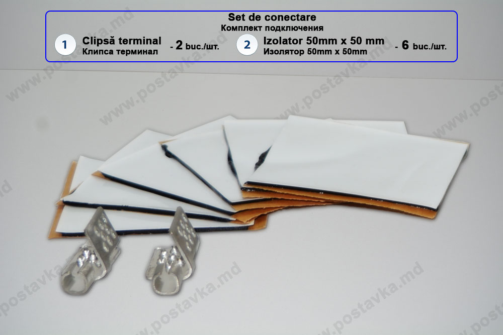 Один монтажный комплект расчитан на подключение одной полосы термопленки. В состав одного монтажного комплекта входят: