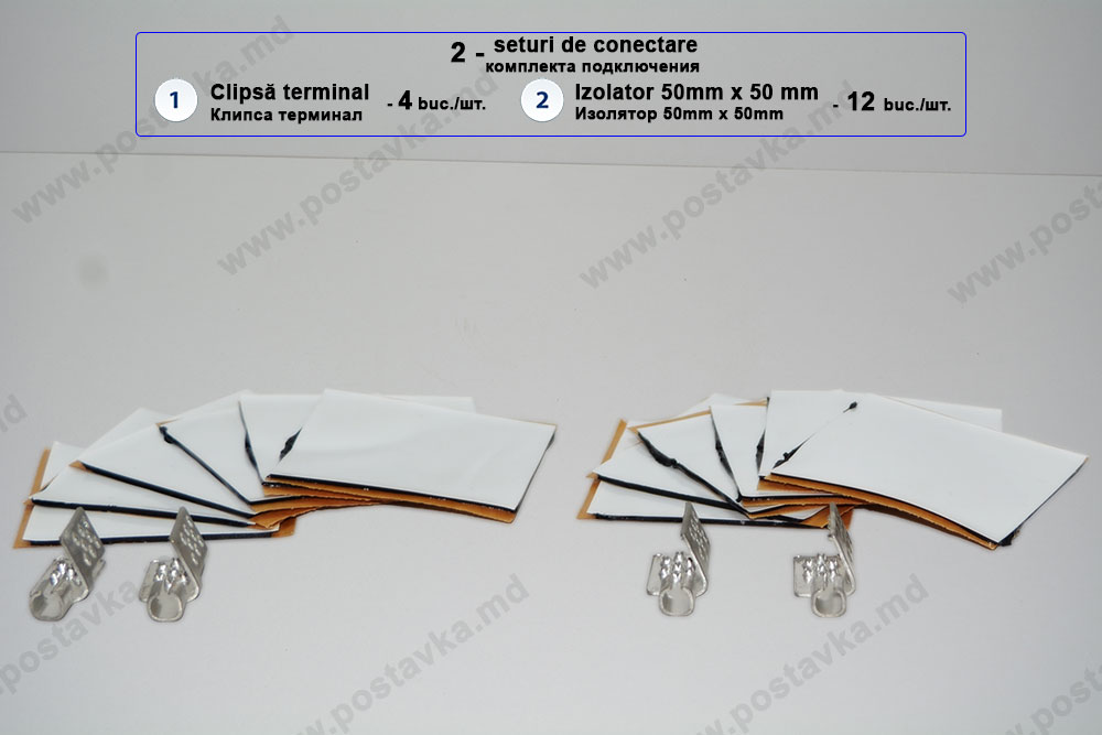 Один монтажный комплект расчитан на подключение одной полосы термопленки. В состав одного монтажного комплекта входят:
