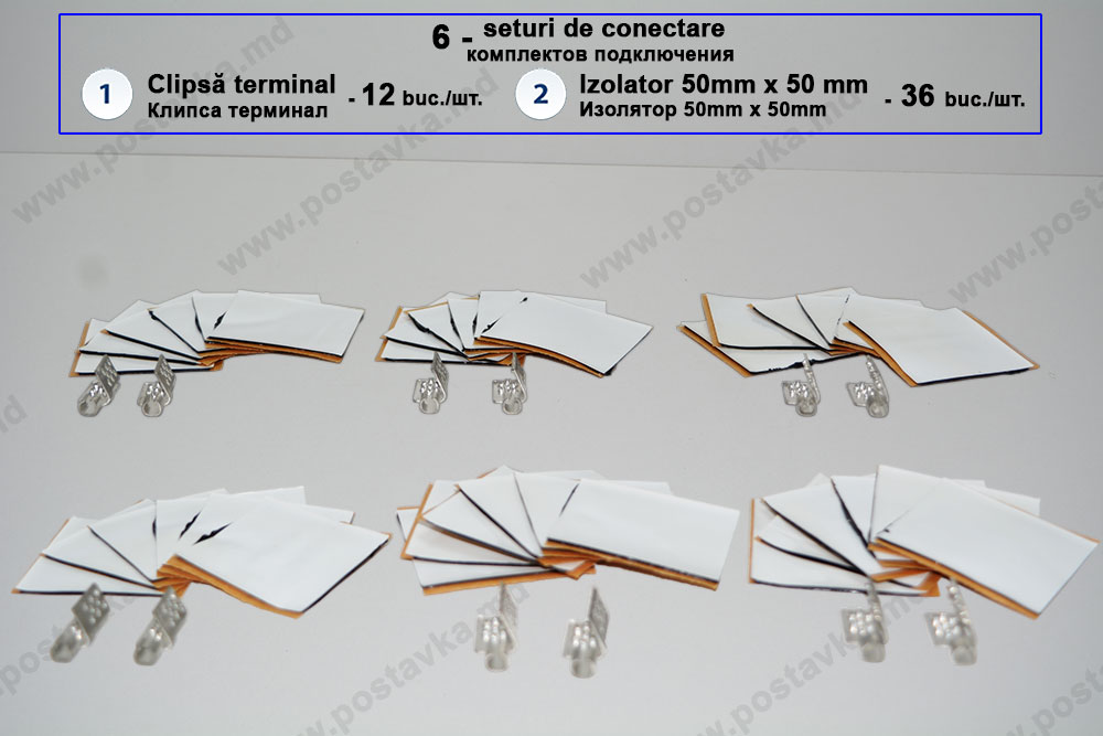 Один монтажный комплект расчитан на подключение одной полосы термопленки. В состав одного монтажного комплекта входят: